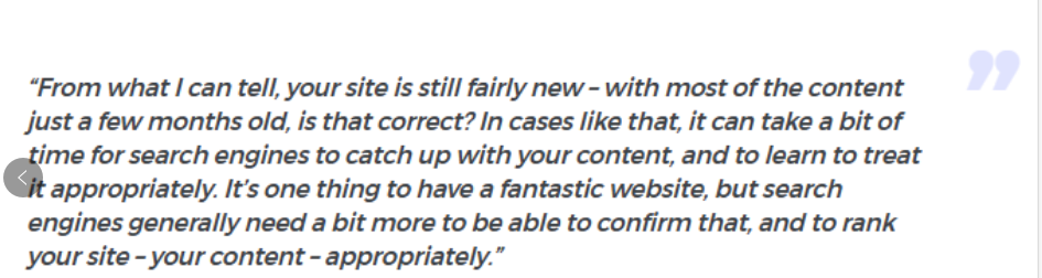 因此,你可能需要花一些時(shí)間才能看到顯著的排名提升,這是很自然的——因?yàn)楣雀枋紫刃枰滥愕木W(wǎng)站是關(guān)于什么的。正如Mueller在另一次談話中提到: