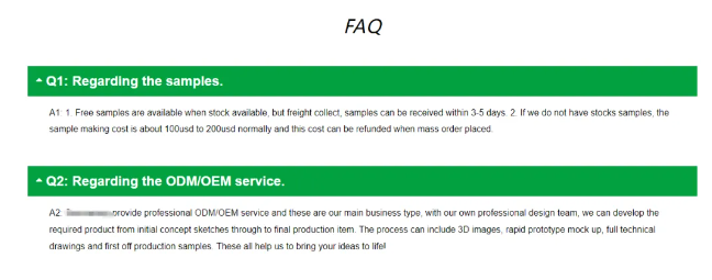 About Us頁面的FAQ板塊:"About Us"頁面是展示公司背景與實力的窗口。在這個頁面的底部,通常會設置FAQ板塊,旨在解答訪客對于品牌、服務、產(chǎn)品線、交貨時間、付款方式等方面的疑問。