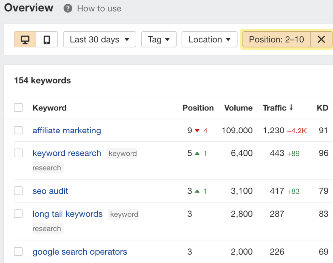 如果您已經在排名跟蹤器等工具中跟蹤了針對網頁定位的主要關鍵字,請過濾您在排名#2-10中排名的關鍵字,然后按估計流量或每月搜索量從高到低進行排序。