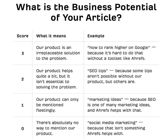 以下是我們在平哥SEO用于關鍵字/內容的“商業價值”量表: