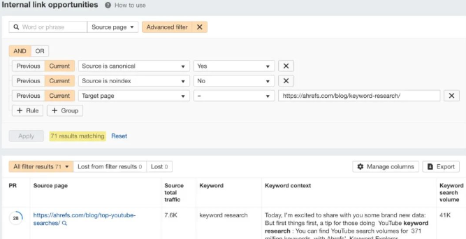 例如,如果我們輸入關鍵字研究指南的URL,我們會看到71個潛在的內部鏈接機會: