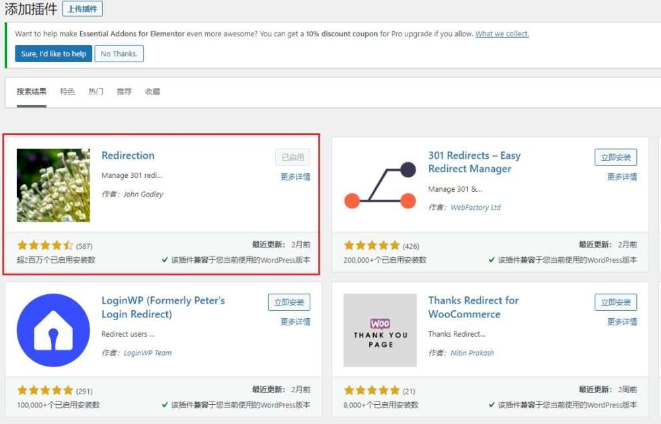 WordPress網站做301跳轉就非常的簡單方便。在WordPress插件里面搜索redirect,就可以找到帶蘑菇插圖的Redirection,然后點擊立即安裝Install,然后激活就可以使用了。