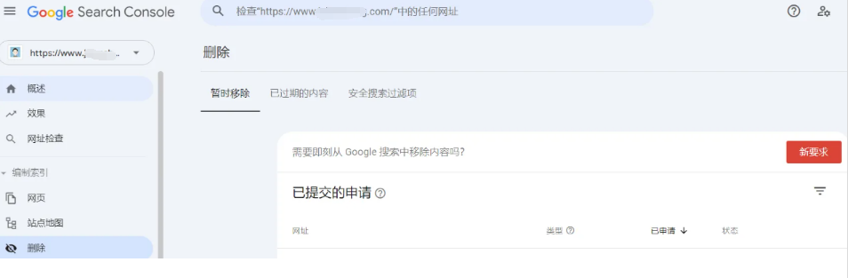 點擊“新要求”提交需要移除的網址即可,雖然上面寫了會禁止出現在Google搜索結果中約6個月,但是我們已經設置了robots.txt文件和該頁面添加了Noindex來禁止Googlebot抓取,那么后面就不會再被抓取了,并且提交的頁面會馬上進入“正在處理請求”狀態,Google Search Console會在1天內處理。