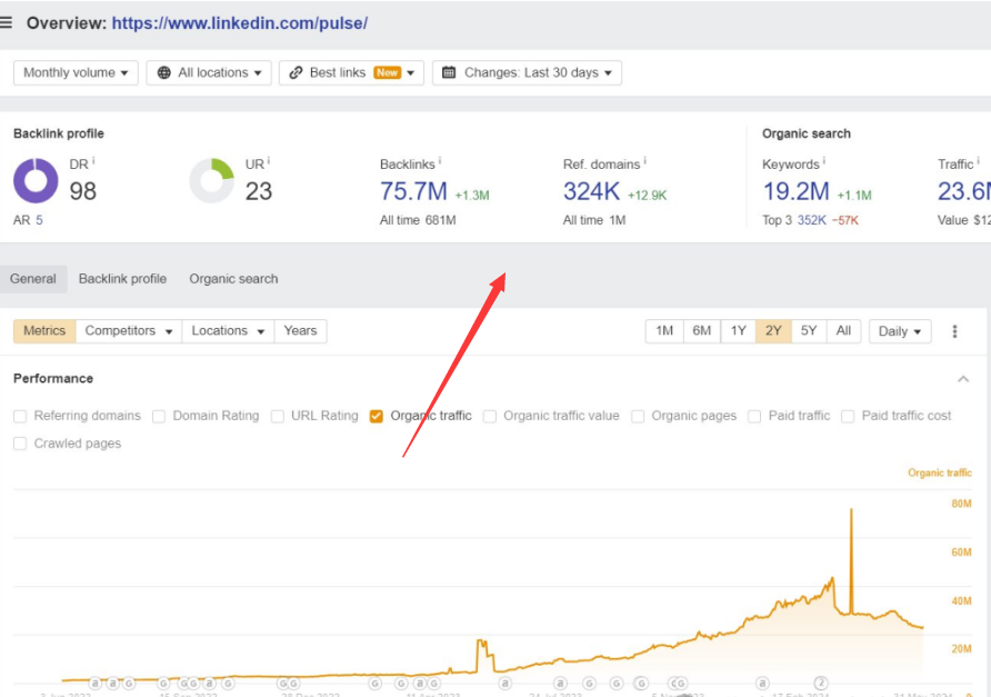 類似這種模式的還有LinkedIn Pulse頁面,也是AI加人工協作的方式去生成內容。從流量數據反饋上看,降權跡象還是很明顯的。