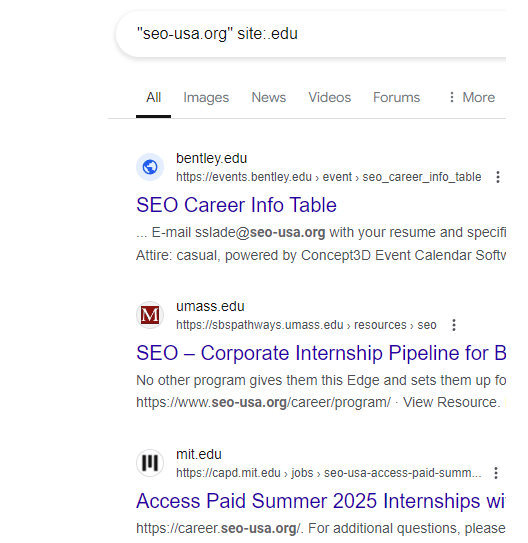 這是高級搜索,顯示了數十個鏈接或提及SEO-USA.org的.edu網站: