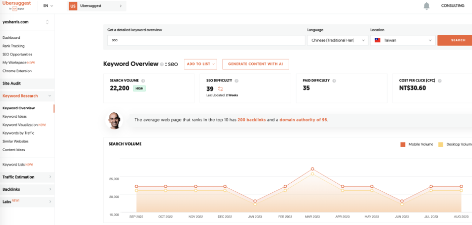 Ubersuggest是行銷專家Neil Patel所開發的SEO工具,使用上非常非常簡單,只要輸入你想查詢的關鍵詞、并選擇所在地區,就會有報表跟數據出現。數據報表內除了搜索量之外,還會提供「關鍵詞競爭度」以及「搜索趨勢」,因為這個工具使用起來容易、費用也較平價,會蠻推薦SEO初學者或是中小企業作為入門使用。
