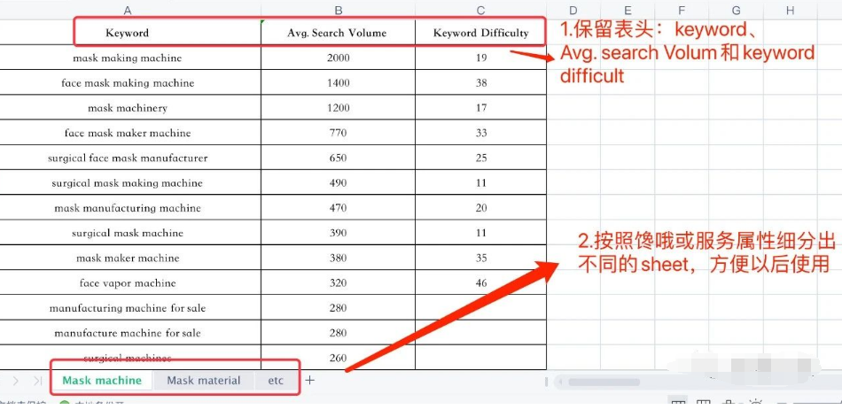 如果網站上產品或服務很多的話,建議按照不同的關鍵詞屬性細分成出多個sheet方便以后使用。紅框中圈住的就是按照產品屬性(比如說口罩機放一個sheet里面,口罩機材料就可以放到另外一個sheet里)細分出來的多個sheet,如下圖所示: