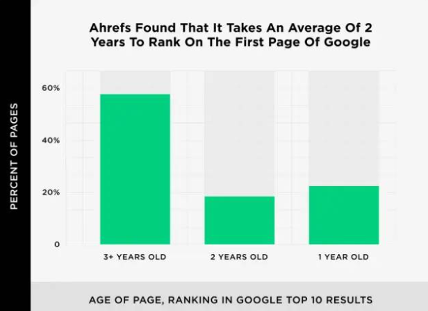 事實上,Ahrefs的一項分析發(fā)現(xiàn),在Google的第一頁上排名平均需要2年的時間。許多排名靠前的頁面是在3年前首次發(fā)布的。