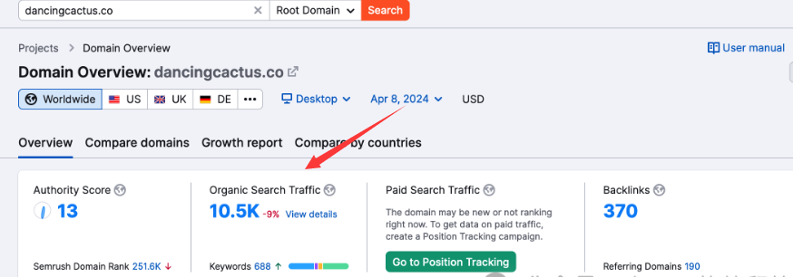 Semrush分析,每月預估流量10.5k,出詞688個。該獨立站的外鏈很少,該站長也沒有刻意做外鏈。