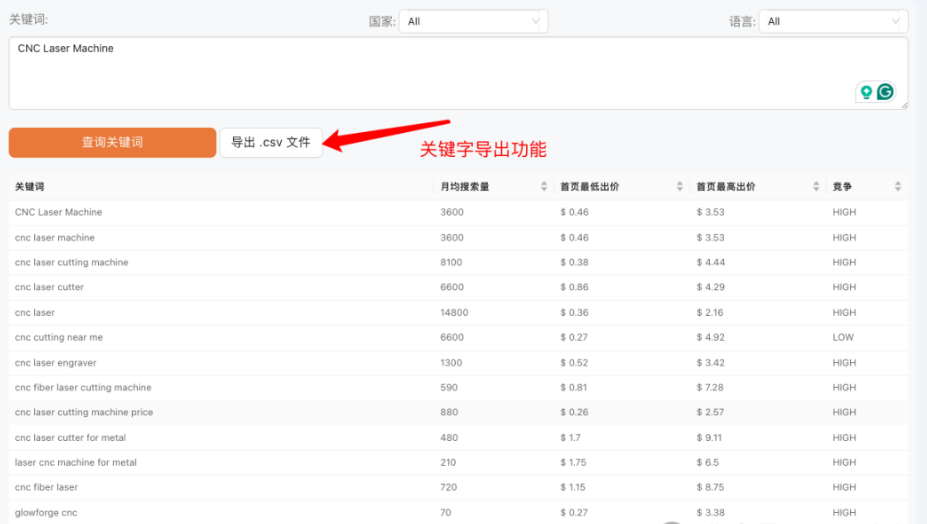 在這里的話,我們就篩選一下,選擇合適的關(guān)鍵字就可以了。我們使用cnc laser cutting machine for sale進(jìn)行接下來的操作。