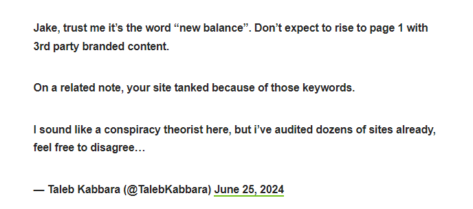 內容創建者Jake Boly最初詢問為什么他的文章以獨特的內容為特色,一直排在搜索結果的第3-4頁,并推測這可能是由于品牌詞的存在。