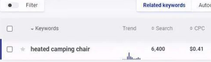 通過(guò)工具分析,我們可以看到“heated camping chair”的SEO難度和月均搜索量如下:SEO難度是28,月均搜索量起伏比較大6k左右。