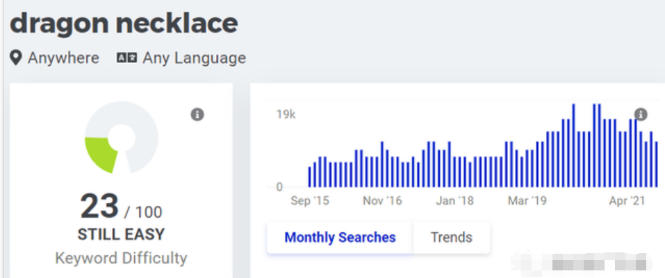 我這里以關(guān)鍵詞dragon necklace來(lái)舉例,平哥使用kwfinder來(lái)進(jìn)行分析,結(jié)果如下: