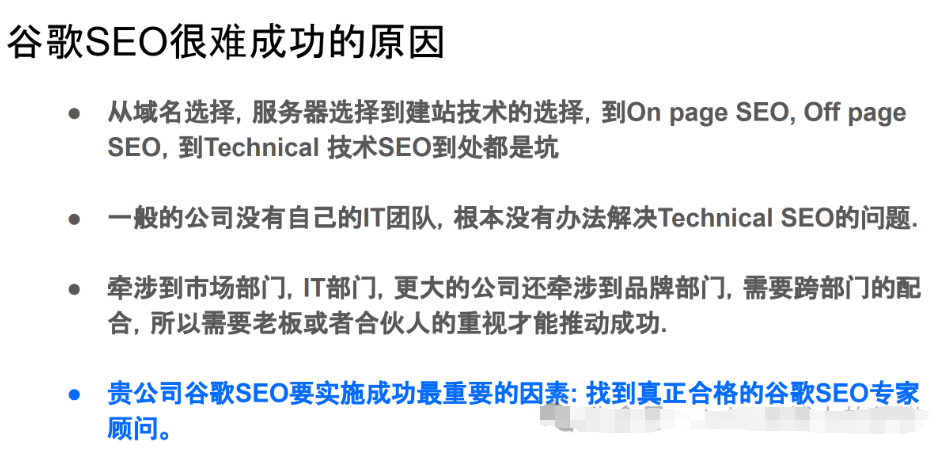 影響Google SEO的因素很多,從域名的選擇,到服務器的選擇,建站技術的選擇,再到On Page SEO,Off Page SEO,再到更高階的Technical SEO和International SEO。很多公司包括國內出海的比較大的公司都沒有自己的IT團隊,根本就沒有辦法解決Technical SEO的問題。