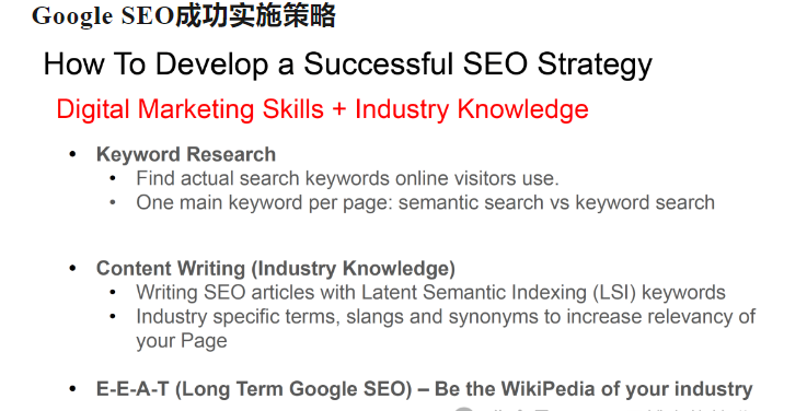 另一方面,Google SEO越來越重視EAT(Expertise,Authority,and Trustworthiness專業,權威和值得信任),擁有專業的行業知識成為谷歌SEO長期成功最重要的因素。谷歌SEO成功實施策略中最花時間的兩項核心能力是做SEO keyword research關鍵字研究和SEO content writing內容創作。這兩項都需要行業知識。