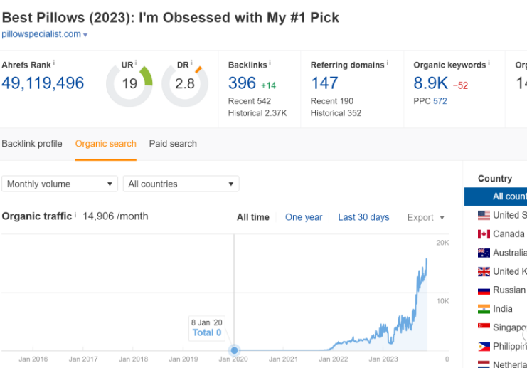pillowspecialist。com,一個DR才3,基本沒啥外鏈,他甚至沒社交媒體,是的,你沒看錯,一個Affiliate站,基本全部都是Money Keywords,各種Review,各種Vs,沒有Info,沒有About Us,什么都沒有。