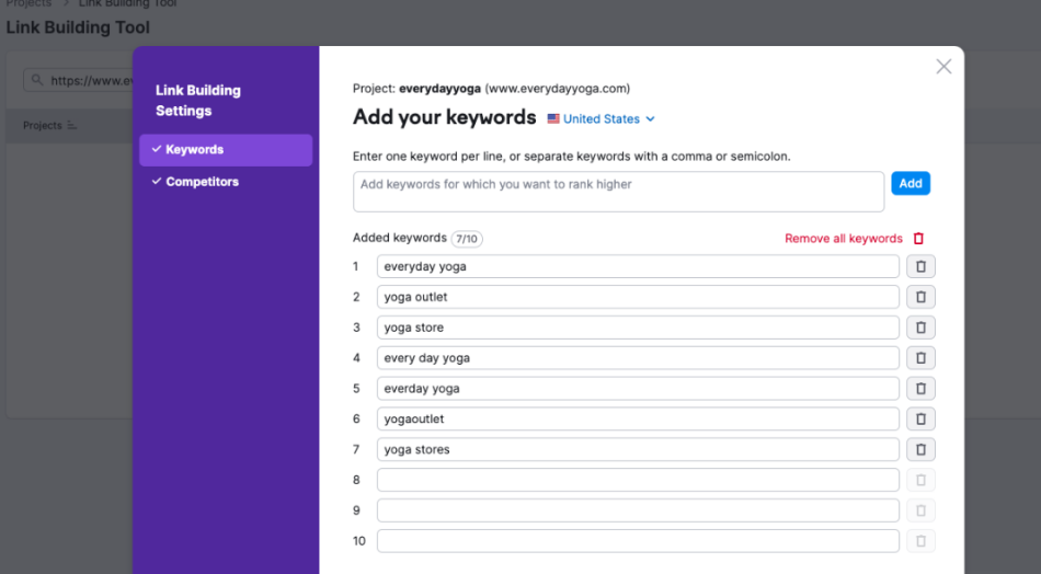 先去“Link Building Tool”下面創(chuàng)建一個Campaign,在里面定義好你需要搜索的關(guān)鍵詞與目標競爭對手。這些元信息定義好之后,SEMRUSH工具會自動從他的數(shù)據(jù)庫中匹配出潛在的外鏈目標網(wǎng)站。