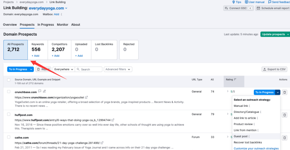 當(dāng)然,我們也可以通過篩選條件去篩選出我們想要做的外鏈類型,簡單動動鼠標即可,并不是什么難事。如下圖,假設(shè)我看中了第一條目標鏈接,想在那個網(wǎng)站上做一條外鏈,直接點擊下“To In Process”進入到下一步。