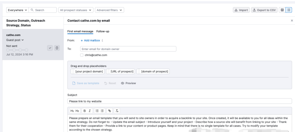 點擊“Contact”按鈕后,便進入到郵件編寫環(huán)節(jié)了。這個步驟SEMRUSH提供了完善的郵件模板,需要我們做的工作其實很少,如果是批量去做的話,直接點擊下一步發(fā)送郵件就可以了。