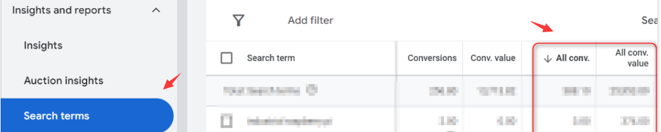 另外,我發現個別產品、搜索詞,GA4顯示有轉化,但Google Ads沒有顯示(見下圖,要從All conv.把次要轉化GA4數據拉出來)。