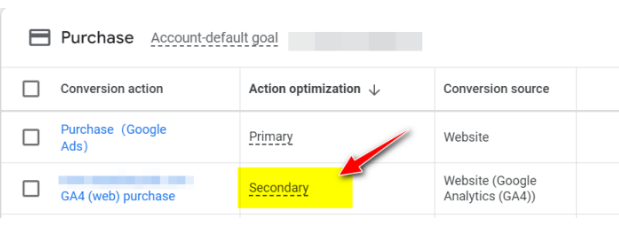 比如,Google Ads部署了Purchase轉化,GA4也導入了Purchase轉化,那么把GA4的Purchase轉化設置為Secondary。