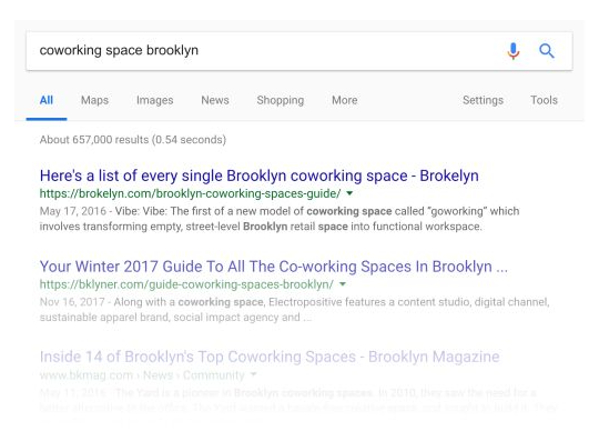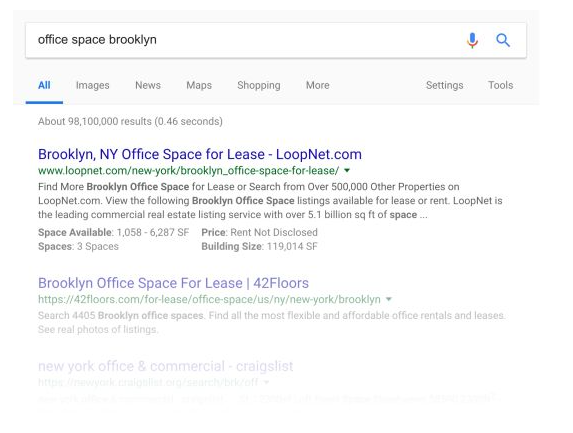 假設(shè)你搜索“Office Space Brooklyn”,那么搜出來的結(jié)果全部都是交易型的: