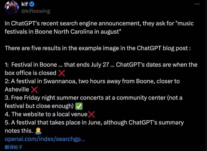 2.搜索體驗結果拉垮,我相信這點大家也明白,Openai現在還不具備對問題的辨別能力。所以很多回答還是很有問題的。比如這哥們就把Chatgpt Search的回答所出現的問題羅列出來了。如圖: