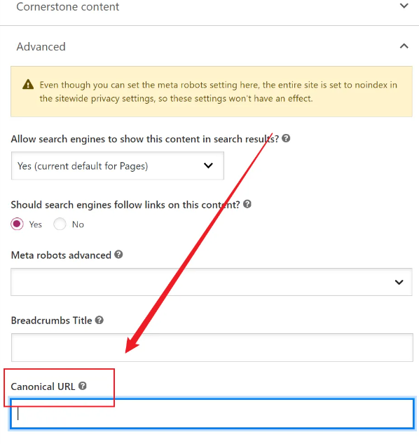wordpress安裝了yoast SEO插件后,在編輯頁最下方y(tǒng)oast SEO高級設(shè)置位置,可以添加Canonical標(biāo)簽