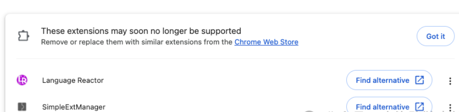 今天在安裝谷歌瀏覽器插件的時候,注意到后臺有這樣的提示信息(如下圖)。大致意思就是下面這兩個插件,因為使用了過時的技術框架且仍未及時更新過來,后續可能會導致插件不可用。