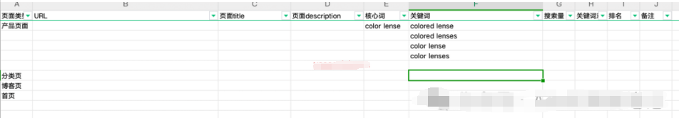 這份表上包含了頁面類型,頁面URL, 頁面title, 頁面description,核心詞,關鍵詞,搜索量,搜索難度和排名。