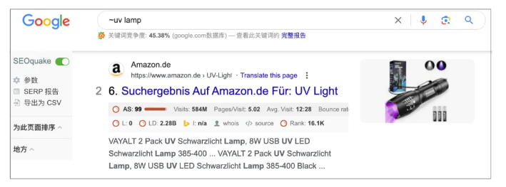 進行近似查詢。在各種語言中,都有一些詞匯含有相同或者近似的意思。使用近似查詢指令,我們可以獲得目標(biāo)關(guān)鍵詞及其近似詞的搜索結(jié)果。比如:搜索~uv lamp,搜索結(jié)果既包含uv lamp,也包含uv light