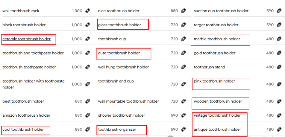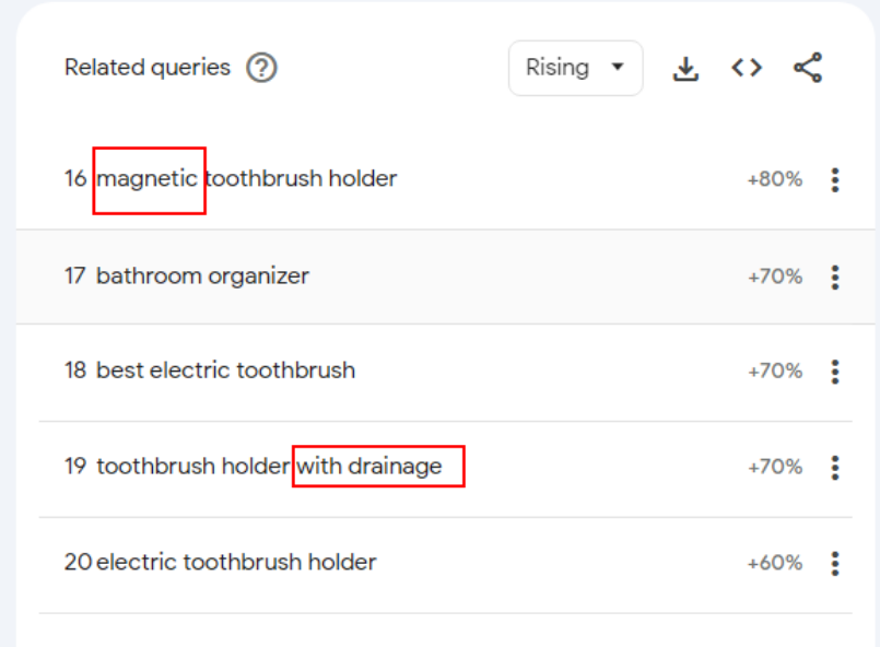 通過這種方式,可以確定產(chǎn)品研發(fā)方向(基于不同牙刷架的需求/趨勢)、主打方向(eg. 帶消毒功能的牙刷架 )及關(guān)鍵詞布局。