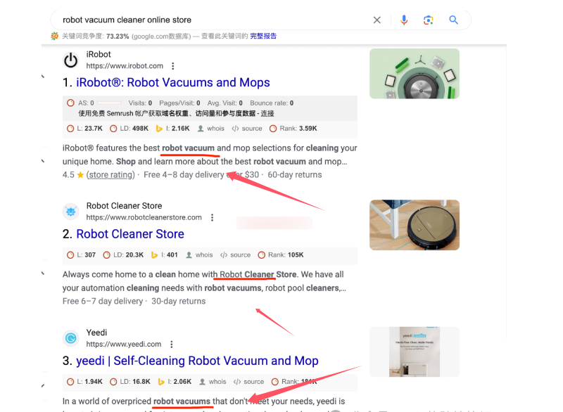 這里的SEO關(guān)鍵詞和谷歌廣告關(guān)鍵詞有所不同,SEO關(guān)鍵詞研究的是用戶搜索意圖和搜索習(xí)慣。舉個(gè)例子比如當(dāng)用戶想購(gòu)買掃地機(jī)器人這個(gè)產(chǎn)品,用戶的搜索詞可不僅僅是“掃地機(jī)器人”,也可能是: