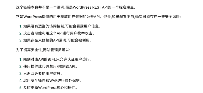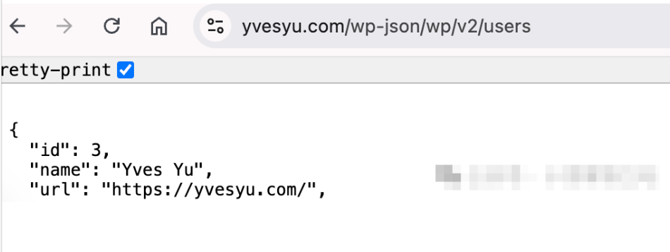 看上圖,我在我的博客域名后面加了“/wp-json/wp/v2/users”這一串定位符,于是便可以看到我這個網站上的所有用戶信息。