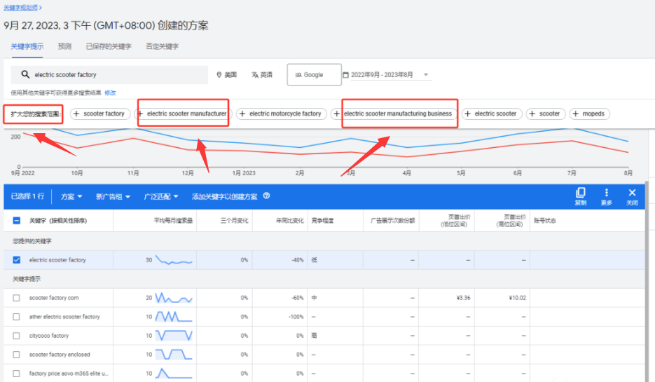 如果你的市場是在全球,那么你直接再選擇國家的時候去掉國家選項,默認就是全球的數據。這里我直接輸入我已知的一個詞,electric scooter factory.