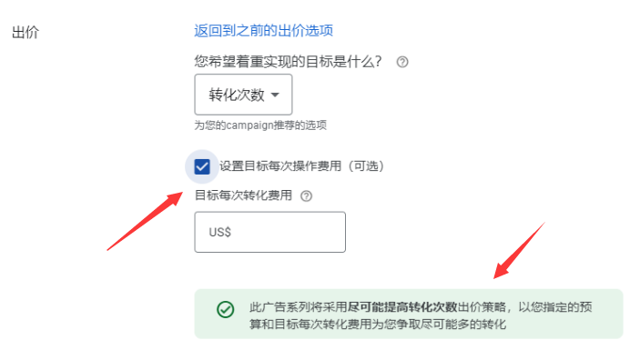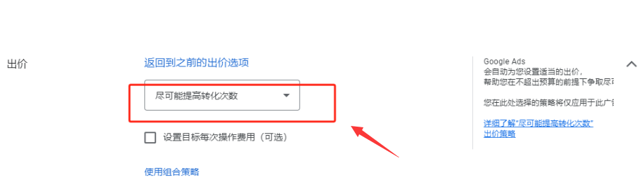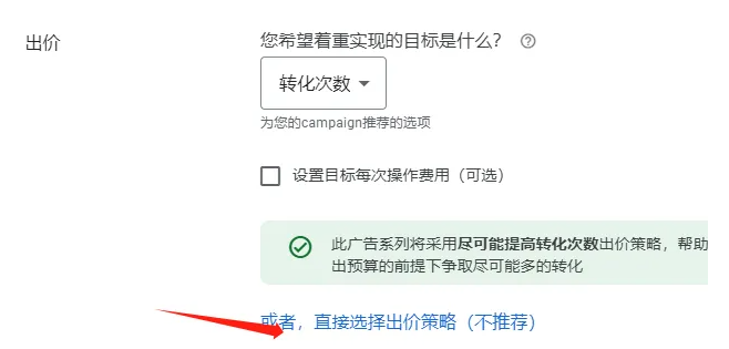 我的個人經驗是,對于對谷歌廣告不是相當熟悉的人,建議直接選擇手動出價策略,并勾選針對轉化進行優化,這樣所有的控制權都再自己的手上,而且仍然可以借用系統自動優化出價,勾選針對轉化進行優。