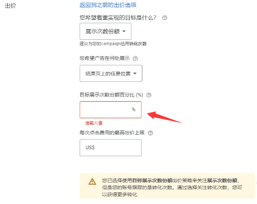 此出價策略用于投放品牌詞的廣告系列較多,假如你希望用戶每次在搜索你的品牌詞時都能展示,那么你可以將目標展示份額設置為100%。