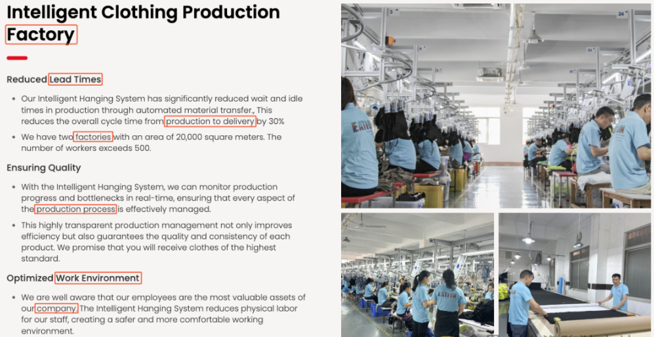 再看相應(yīng)的工廠介紹信息,左側(cè)的文字描述介紹了工廠的簡單歷史,并描述了工廠的生產(chǎn)能力與相應(yīng)的交期保證信息,右側(cè)更是布局了信任度非常不錯的工廠生產(chǎn)場景。