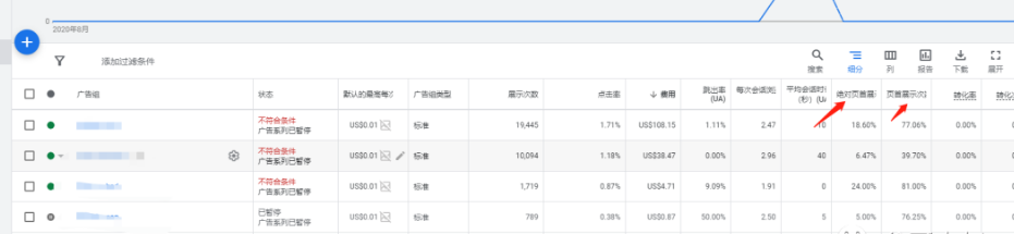 2、看我們的頁首展示份額。如果你出價太低,那么你的頁首展示份額以及絕對頁首展示份額可能也會相對較低,你的廣告大部分時間可能展示在搜索結果下方,那么意味著目標客戶已經看過很多網站了,才看到你。