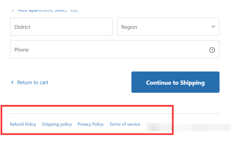 確保付款流程全程都有Shipping policy、Return&Exchange,policy以及Privacy policy可點擊和展示