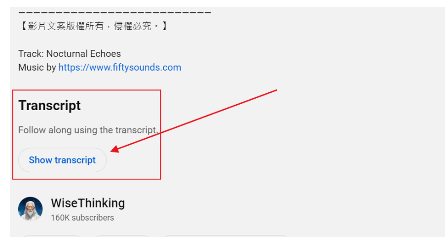 首先,我們需要從目標視頻中提取文本內容。打開YouTube視頻,描述里面點擊“更多/more”按鈕,然后選擇“顯示字幕”功能。如果視頻沒有字幕,可以嘗試使用其他方法提取文本。提取完成后,復制所有文本內容。如圖: