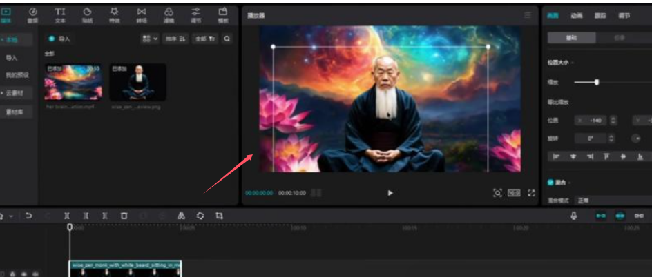 首先,將之前生成的圖片、視頻和語音素材導入剪映,并按照視頻腳本的順序進行排列。然后,調整圖片和視頻的比例和位置,使畫面更加協調美觀。如圖: