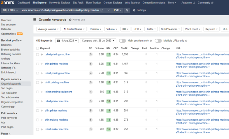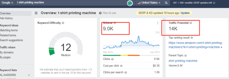 比如t shirt printing machine,搜索量9k在美國,排名第一的頁面的預估TP確是14k,因為這個頁面還排了很多的次級關鍵詞: