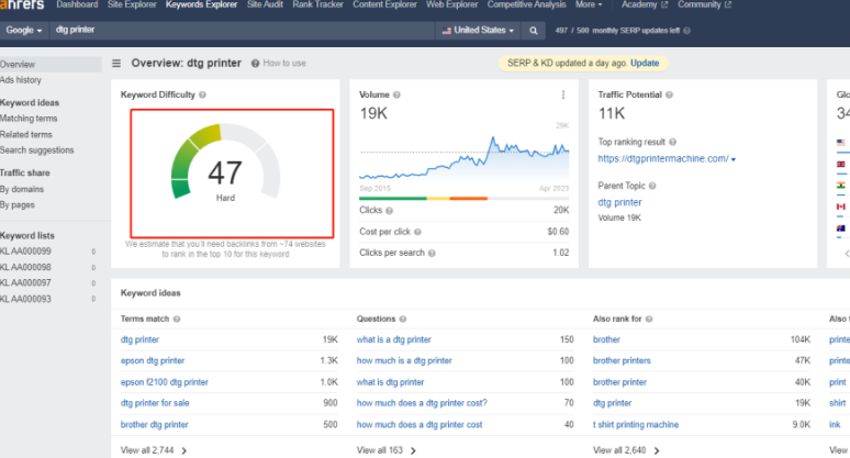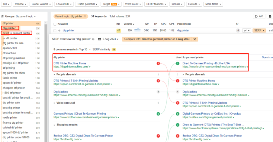 比如下面這個dtg printer和direct to garment printer,前者只是后者的縮寫,含義一樣,卻是兩個parent topic。dtg printer的KD值為48更高,而direct to garment printer的KD值為37,更低。