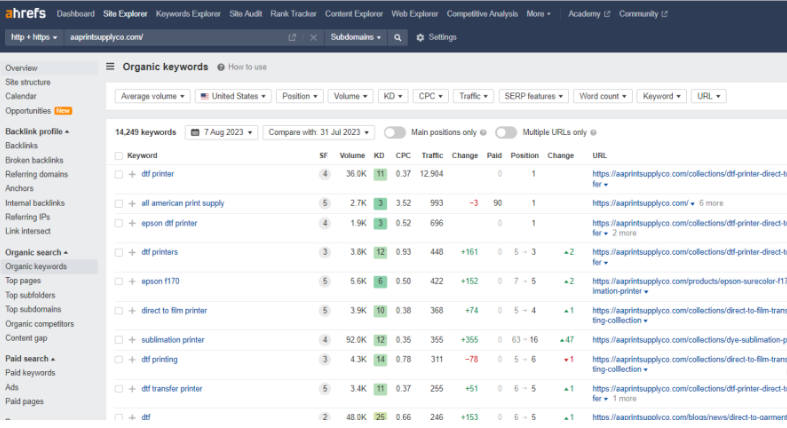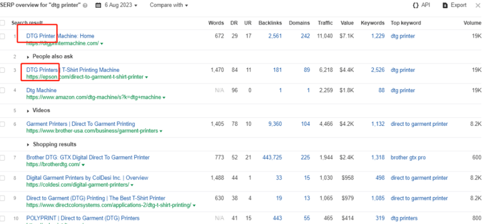 這種情況,如果你有信心做KD值更高的,可以把這兩個詞放在一個頁面上,主詞是dtf printer,如果kd高的這個排名不錯,Kd低的也會有排名。但是這兩個的競爭程度相差大,如果KD大的做不上去,KD小的這個更難做上去。所以這種情況建議把KD值小的單獨拿出來做為主詞去上排名。