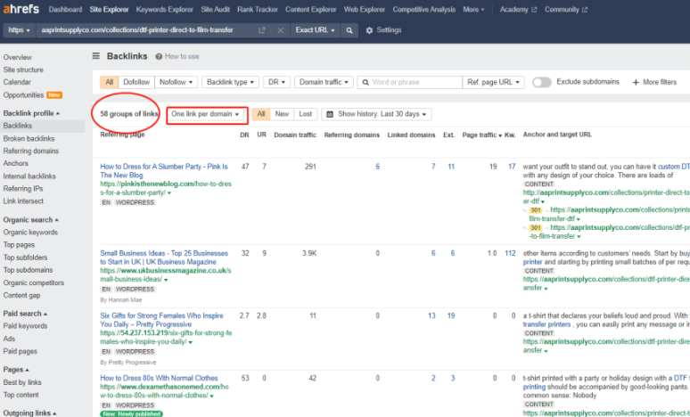 比如最開始Dtf printer排名第一頁面的引薦域名有57個,篩選一下就是43個了。而43個中page Traffic有數據的頁面也才2個。