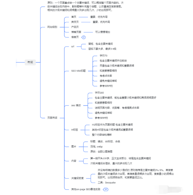 網站關鍵詞應該布局在哪些地方?關鍵字布局的原則是:一個頁面重點做一個主要關鍵詞,可以概括整個頁面內容的。次級關鍵詞放在內容中,副標題等補充整個話題,以盡量滿足搜索意圖。相關的次級關鍵詞和詞根量大則多出現幾次,少的出現即可。布詞相對簡單,是Onpage SEO的內容: