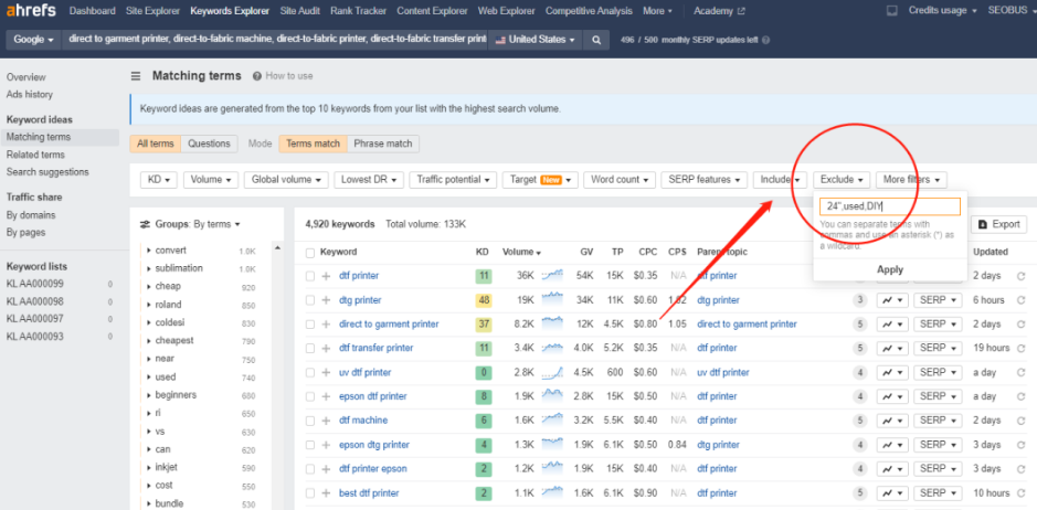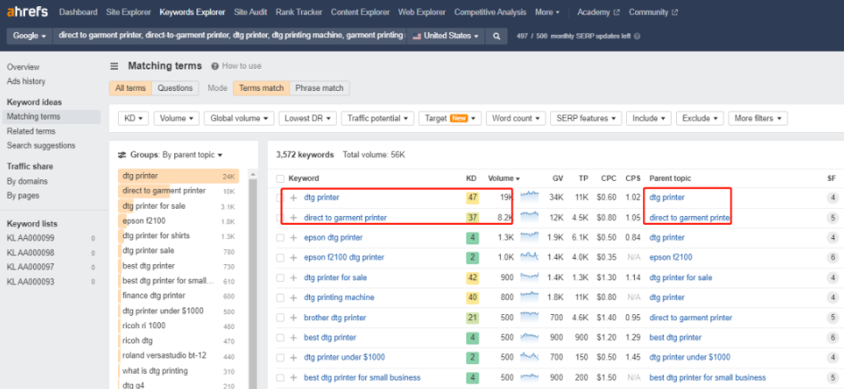 比如你是做Dtg printer的,可以借助parent topic給拓出來的詞分組,點擊parent topic,里面是一組他的次級關鍵詞,這樣很多詞都可以放在一個頁面。比如這里的dtg shirt printer,direct to garment printing machine,dtg printer machine等完全可以放在以DTG printer為主要關鍵詞的頁面里面。