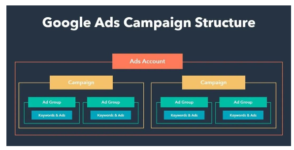 注冊成功后,進入谷歌廣告賬戶后臺,設置賬戶結構。賬戶結構主要包括以下幾個層次: