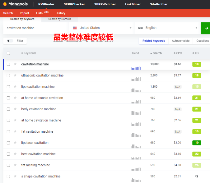 美國有90的搜索量,且難度很低。所以如果這篇標題改成:Cavitation machine benefits:Does cavitation really work,再適當調整全文的關鍵詞布局,出詞概率會大大提升。(PS:does cavitation really work美國搜索量100)